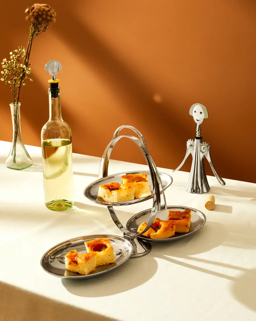 В развернутом виде Anna G. представляет собой три круглые тарелки из зеркально отполированной нержавеющей стали 18/10, на каждой из которых можно подать различные виды закусок и закусок, а также небольшие сладкие кексы или пирожные.