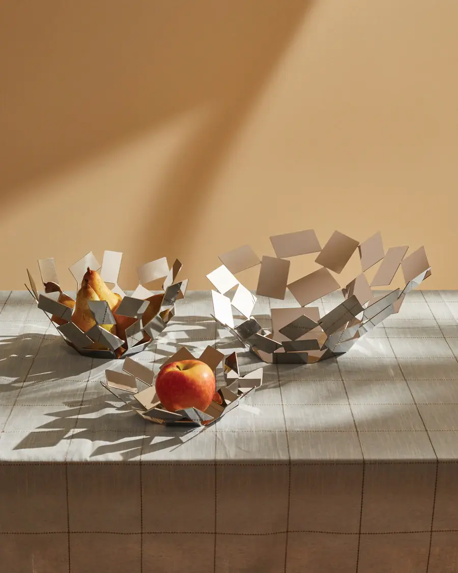 Корзина для фруктов La Stanza dello Scirocco от Alessi была разработана Марио Тримарчи. Художник был вдохновлен атмосферой Сицилии. Необработанные геометрические формы корзины притягивают взгляд и распространяют вокруг себя таинственную ауру. Она идеально подходит для подачи фруктов и станет прекрасным украшением минималистичной квартиры. Она доступна в белом и черном цветах, а также в полированной стали.