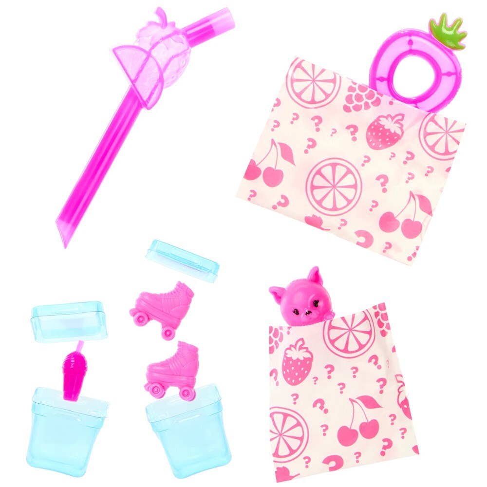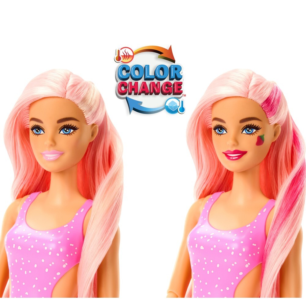 У красивой куклы Барби длинные розовые волосы и шорты с фруктовым мотивом. Макияж и волосы куклы меняют цвет под воздействием холодной воды. Чудесные метаморфозы сопровождает мягкий, ароматный питомец!