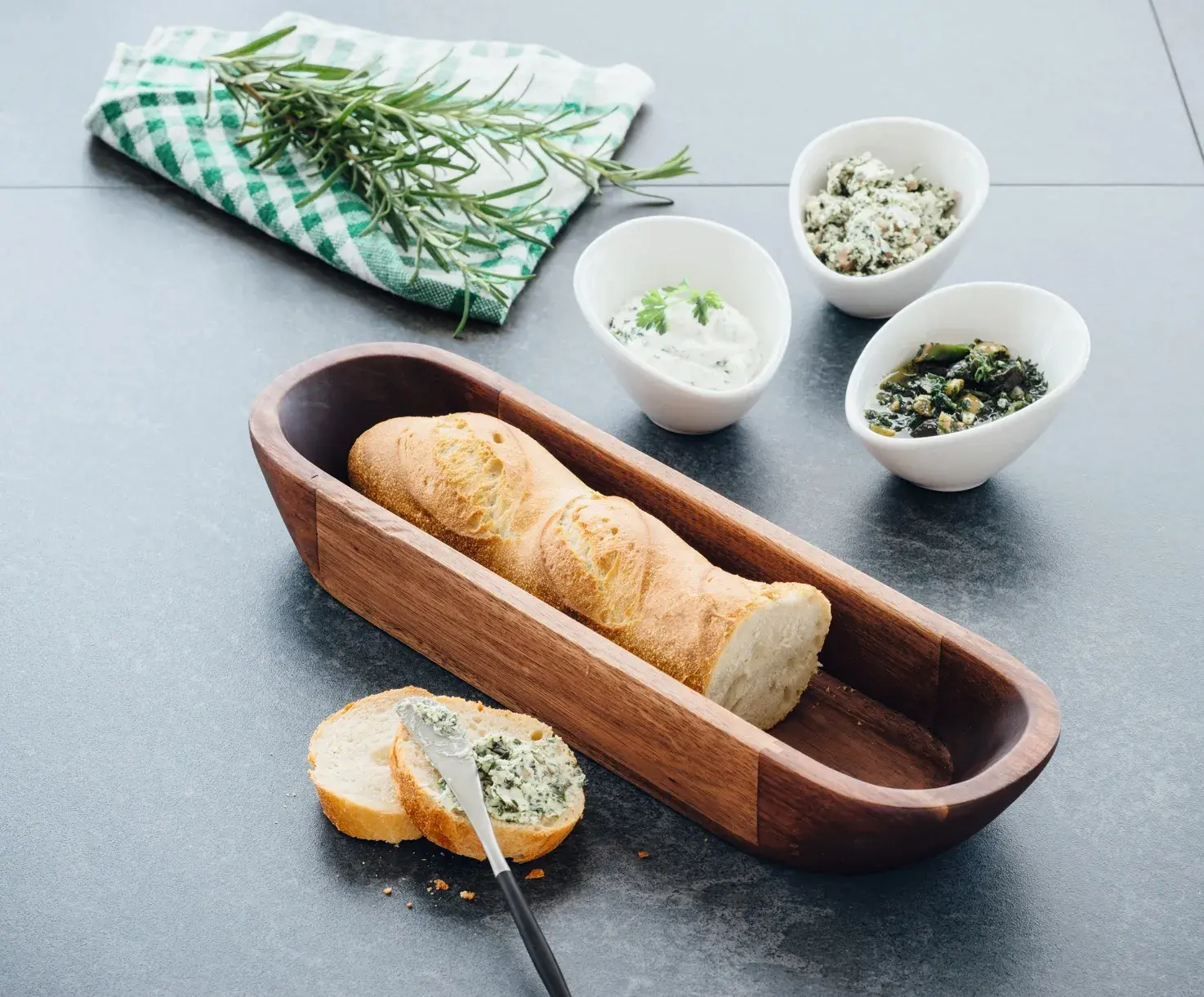 Миска длиной 38 см из дерева акации от бренда Asa-Selection идеально подходит для подачи хлеба с корочкой.