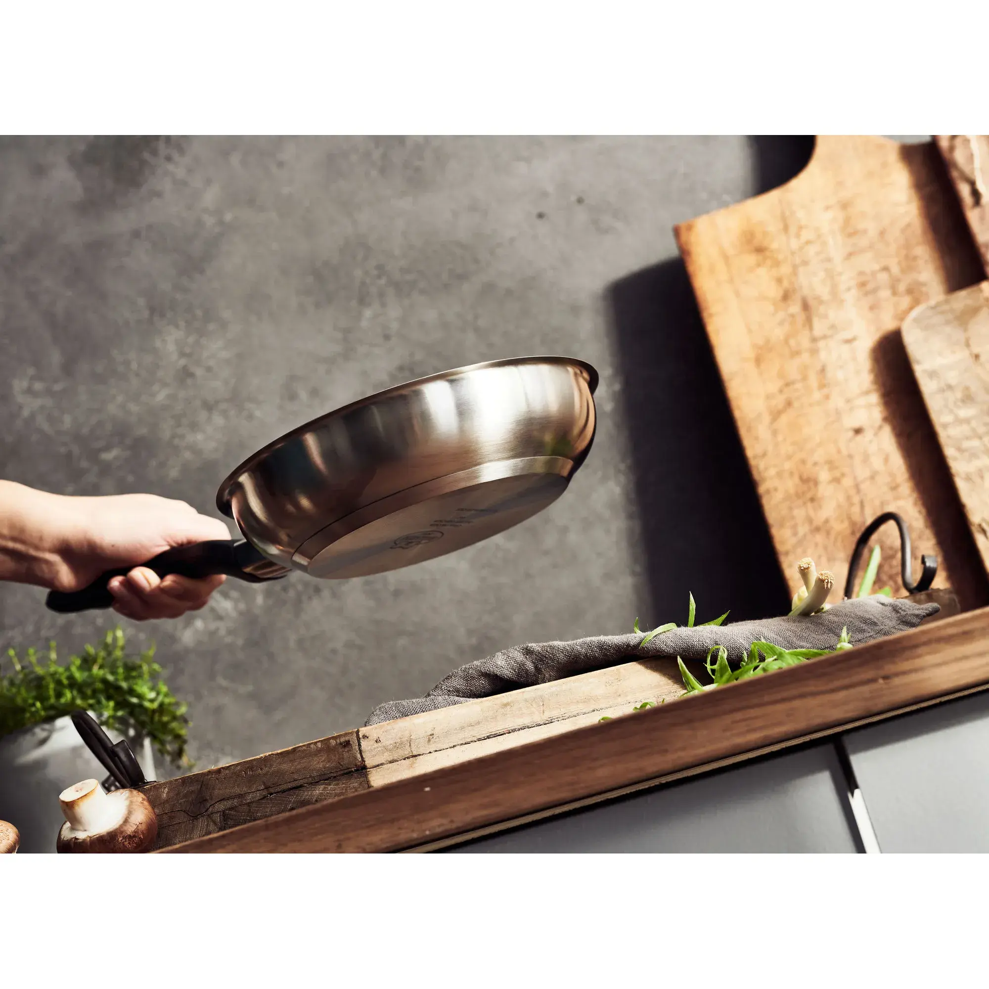 Внешняя поверхность сковороды усилена нержавеющей сталью 18/10, которая более устойчива к коррозии и повреждениям, что делает ее безопасной для мытья в посудомоечной машине. Эргономичные ручки дополнительно покрыты прочным пластиком для предотвращения нагрева и повышения удобства.