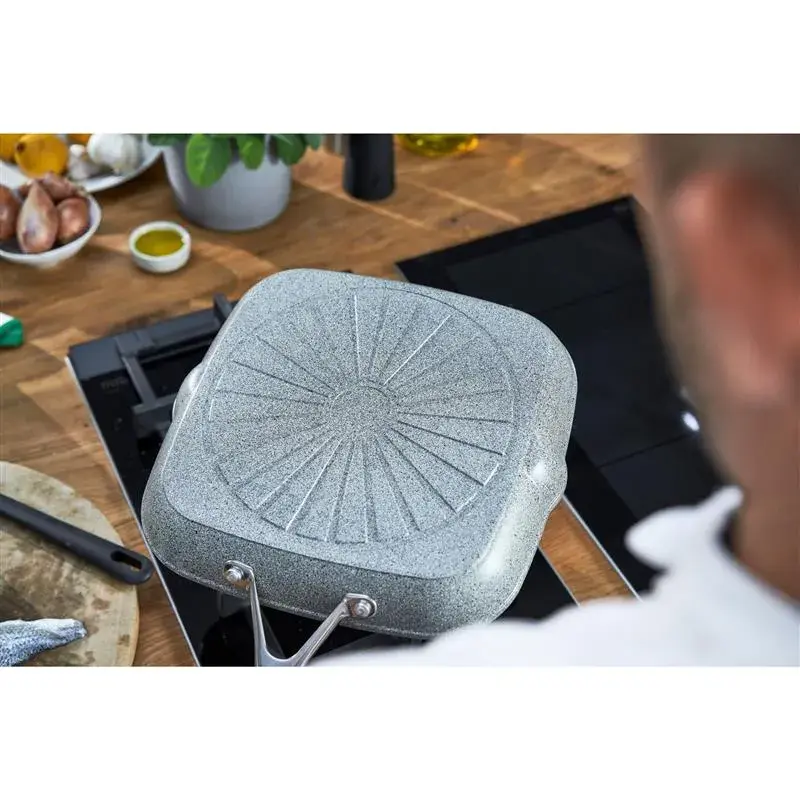 Сковорода-гриль Salina Granitium размерами 28х28 см от итальянского бренда Ballarini – это сосуд, изысканный в каждой детали. Благодаря антипригарному 6-слойному покрытию Granitium Ti-X, усиленному слоем титана, сковорода чрезвычайно прочна.