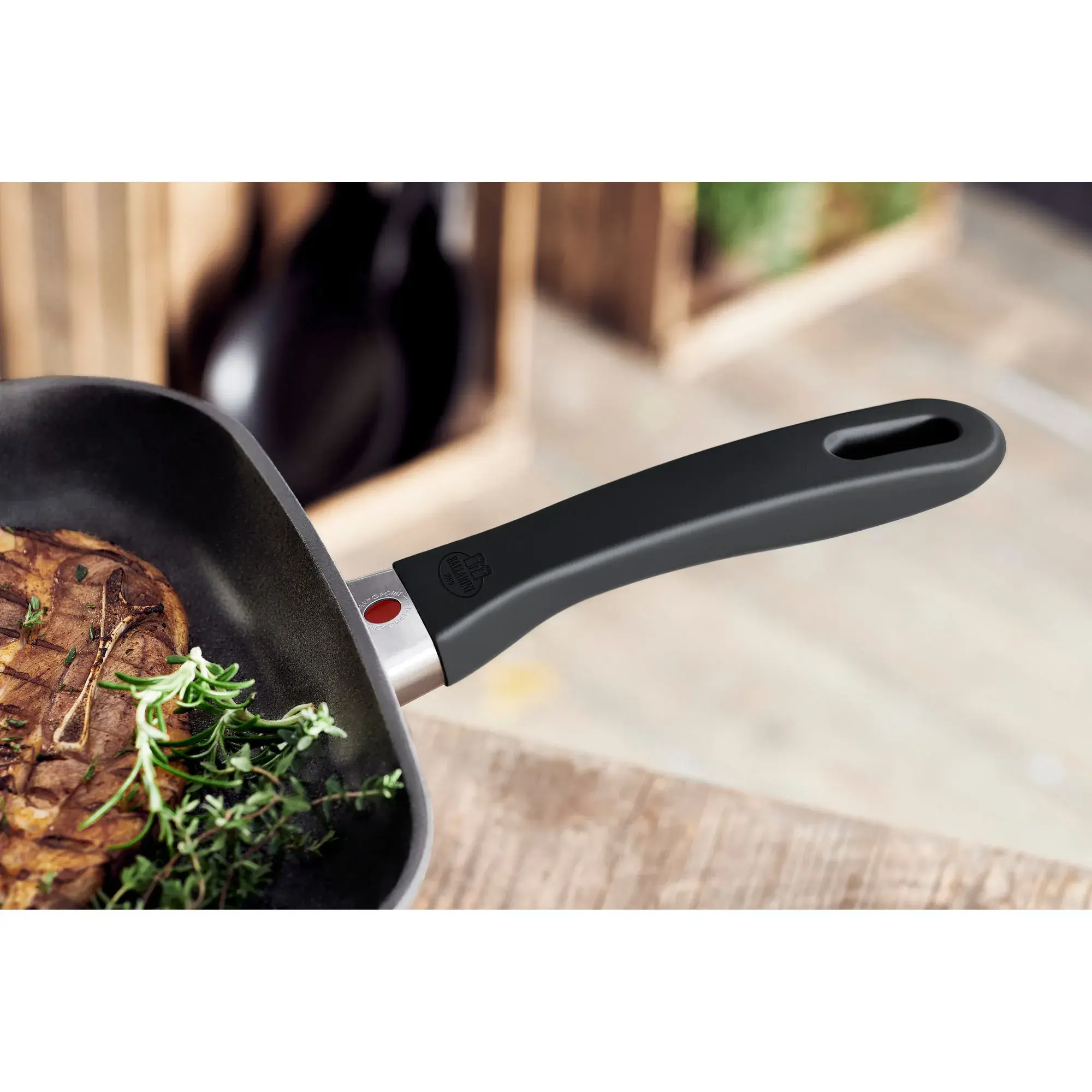 - Термопоинт на ручке кастрюли информирует об оптимальном нагреве покрытия