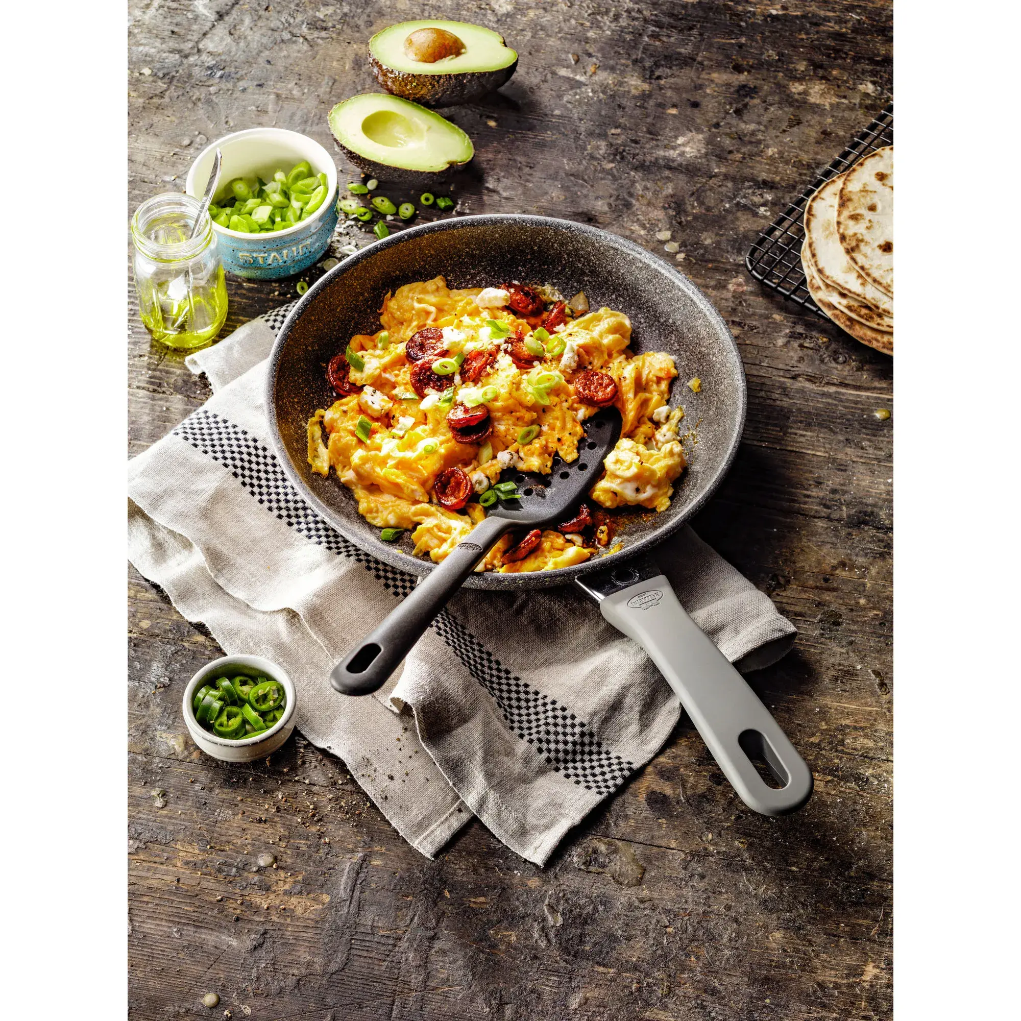 Дно сковороды Murano изготовлено из многослойного кованого пищевого алюминия. Благодаря такому использованию все сковороды серии Murano подходят для всех типов плит, включая индукционные. Многослойное дно сковороды также прекрасно поглощает тепло, что делает жарку любимых блюд более эффективной и энергосберегающей. Термопоинт, расположенный на огнезащитном воротнике ручки, проинформирует вас об оптимальном нагреве покрытия и его готовности к работе.