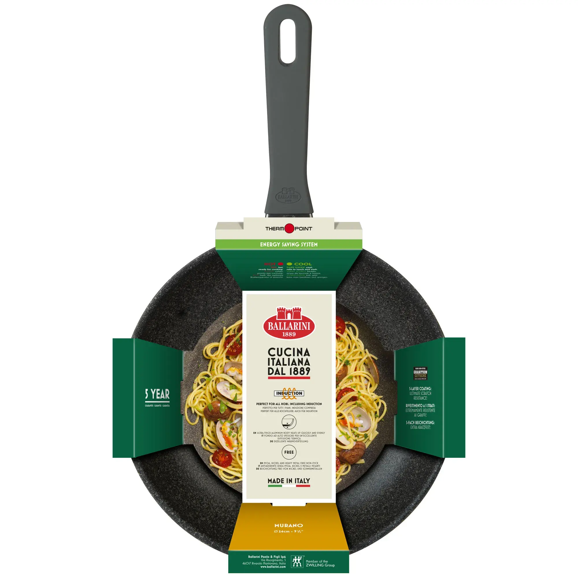 Неглубокая сковорода диаметром 24 см из коллекции Murano от итальянского бренда Ballarini – многофункциональная посуда, которая должна быть на кухне каждого любителя жарки с небольшим количеством жира. Достоинством универсальности является чрезвычайно стойкое 5-слойное покрытие Granitium Extreme. За элегантный внешний вид гранитной сковороды отвечает дуэт миланских дизайнеров: Маттео Тун и Антонио Родригес.