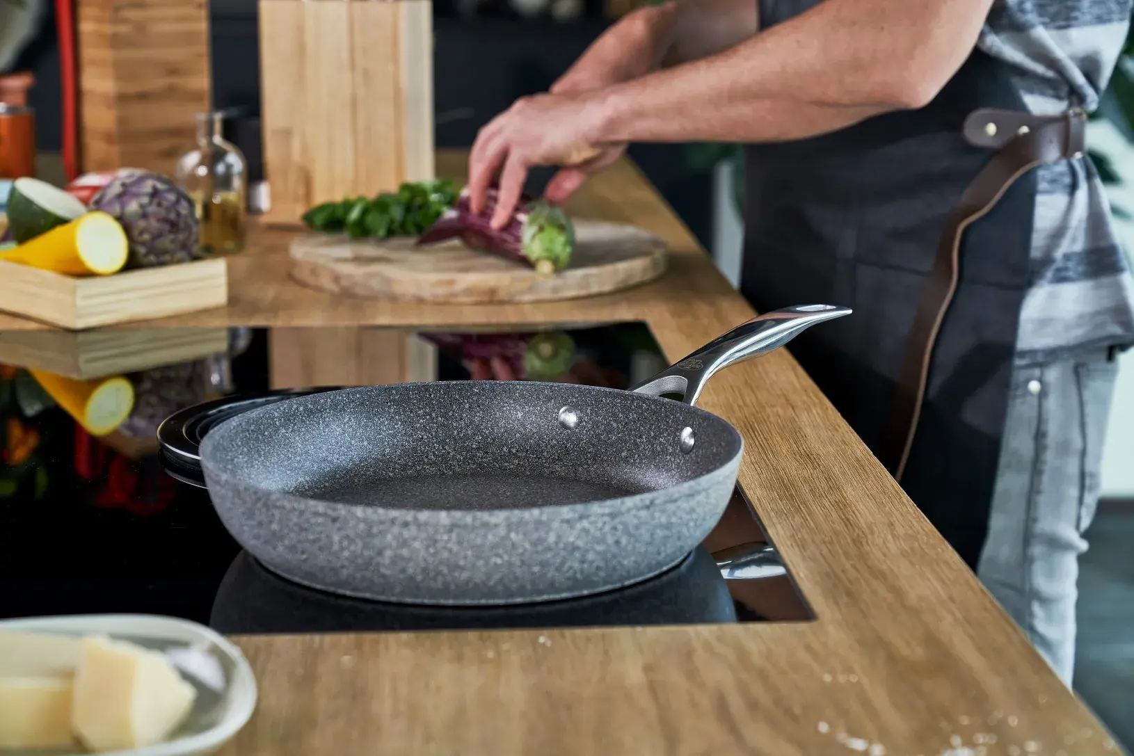 Дно сковороды Salina Granitium изготовлено из многослойного кованого пищевого алюминия. Такое использование означает, что вся посуда этой серии подходит для всех типов плит, включая индукционные. Многослойное дно сковороды также прекрасно поглощает тепло, что делает жарку любимых блюд более эффективной и энергосберегающей.