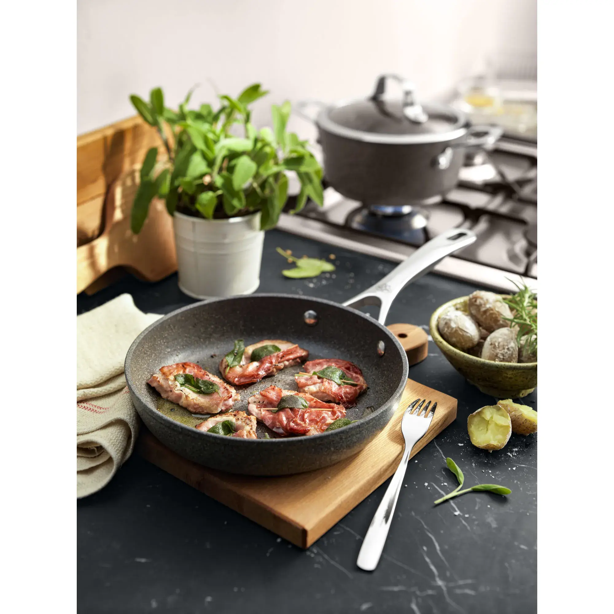 Дно сковороды Salina Granitium изготовлено из многослойного кованого пищевого алюминия. Такое использование означает, что вся посуда этой серии подходит для всех типов плит, включая индукционные. Многослойное дно сковороды также прекрасно поглощает тепло, что делает жарку любимых блюд более эффективной и энергосберегающей.