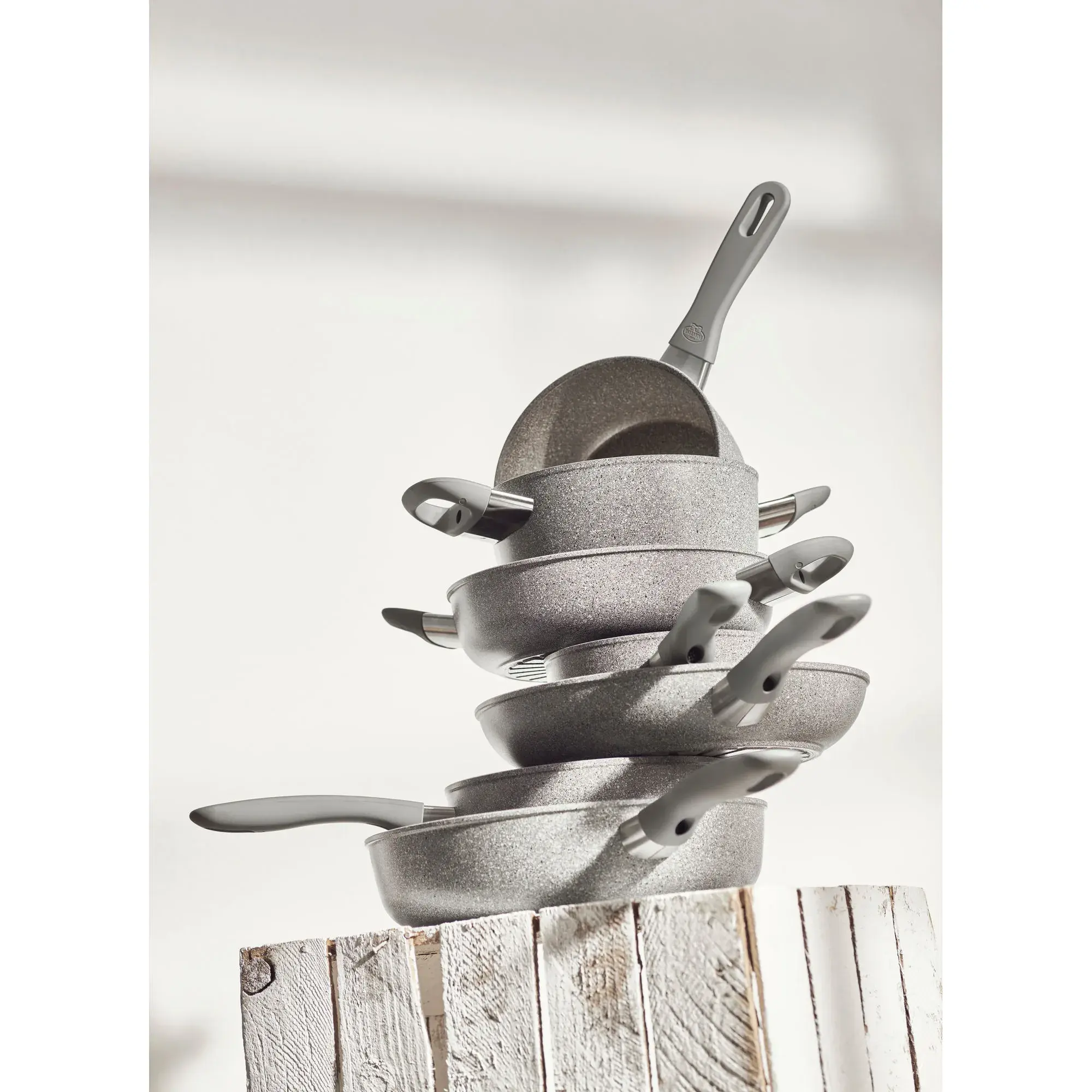 Стоит отметить эргономичную ручку из пластика soft-touch, которая не нагревается, гарантируя, что она всегда будет оптимальной температуры, что исключает риск ожогов. Также на конце ручки имеется отверстие, позволяющее подвешивать сковороды на кухонный крючок.