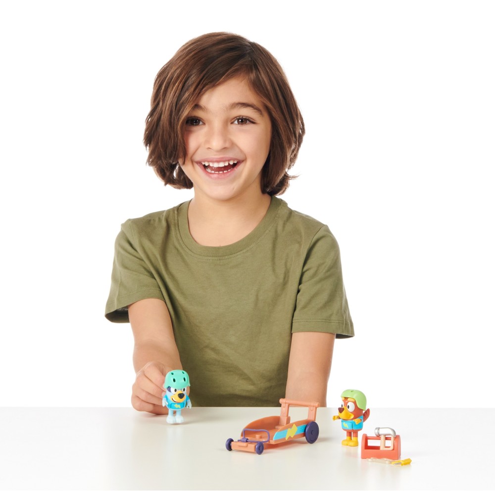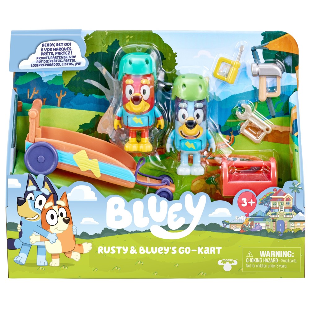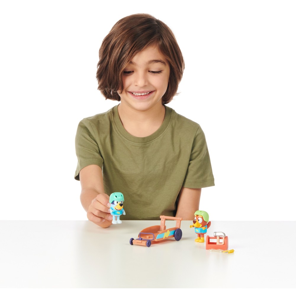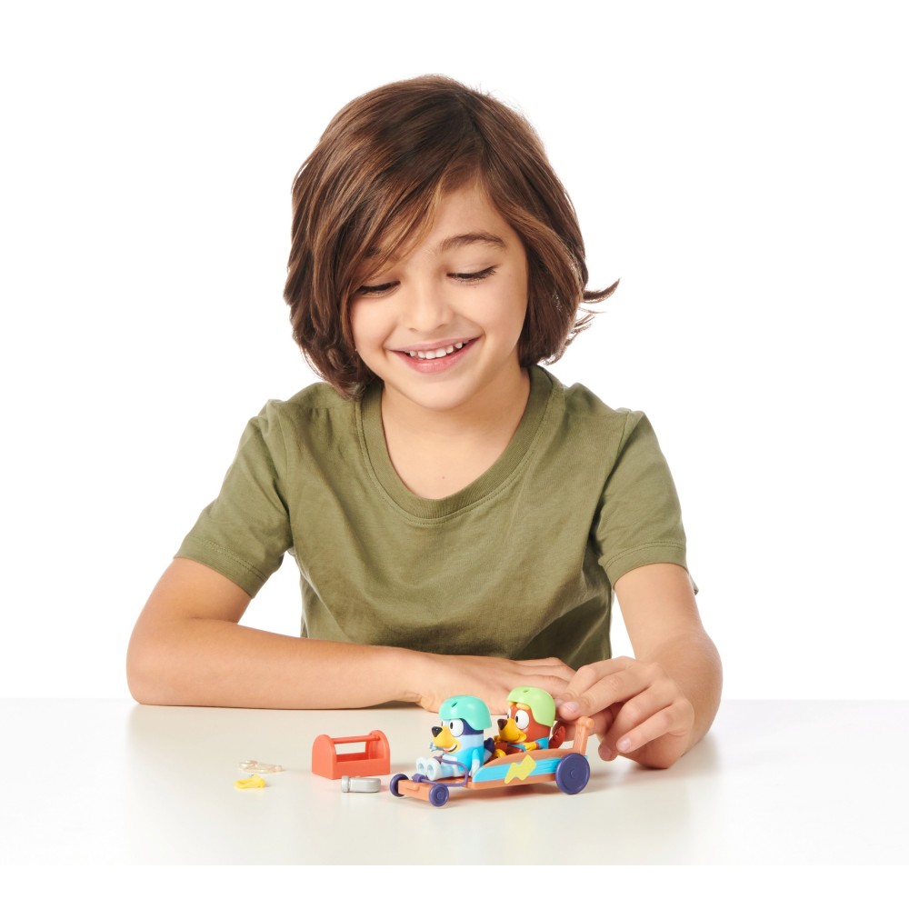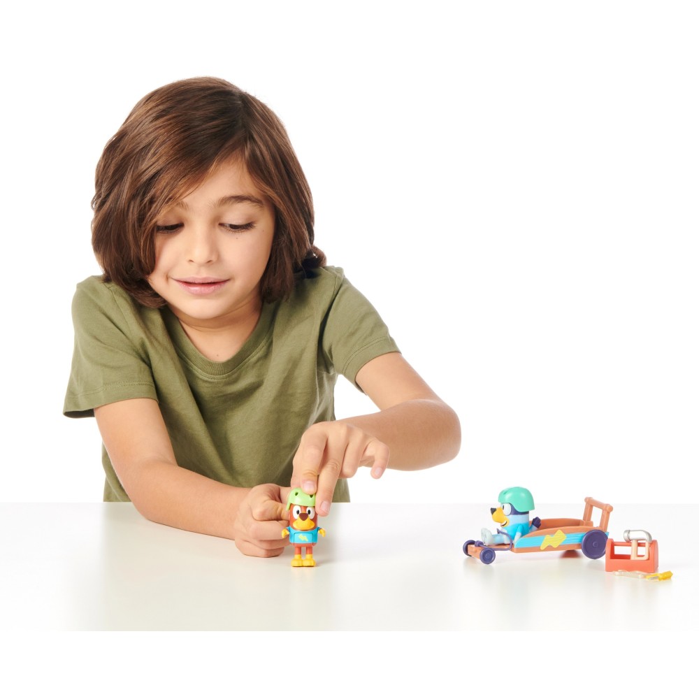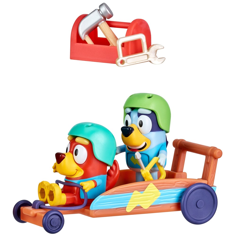 Набор Гокарт переносит детей в мир динамичных гонок и веселой игры! Bluey и ее друг Рыжик устраивают гонку. Здесь будет много смеха и немного соревнования. У щенков есть шлемы, чтобы чувствовать себя безопасно во время игры. Они также могут играть в ремонт автомобиля. В красном ящике они найдут самые необходимые инструменты - ключ, отвертку и молоток.