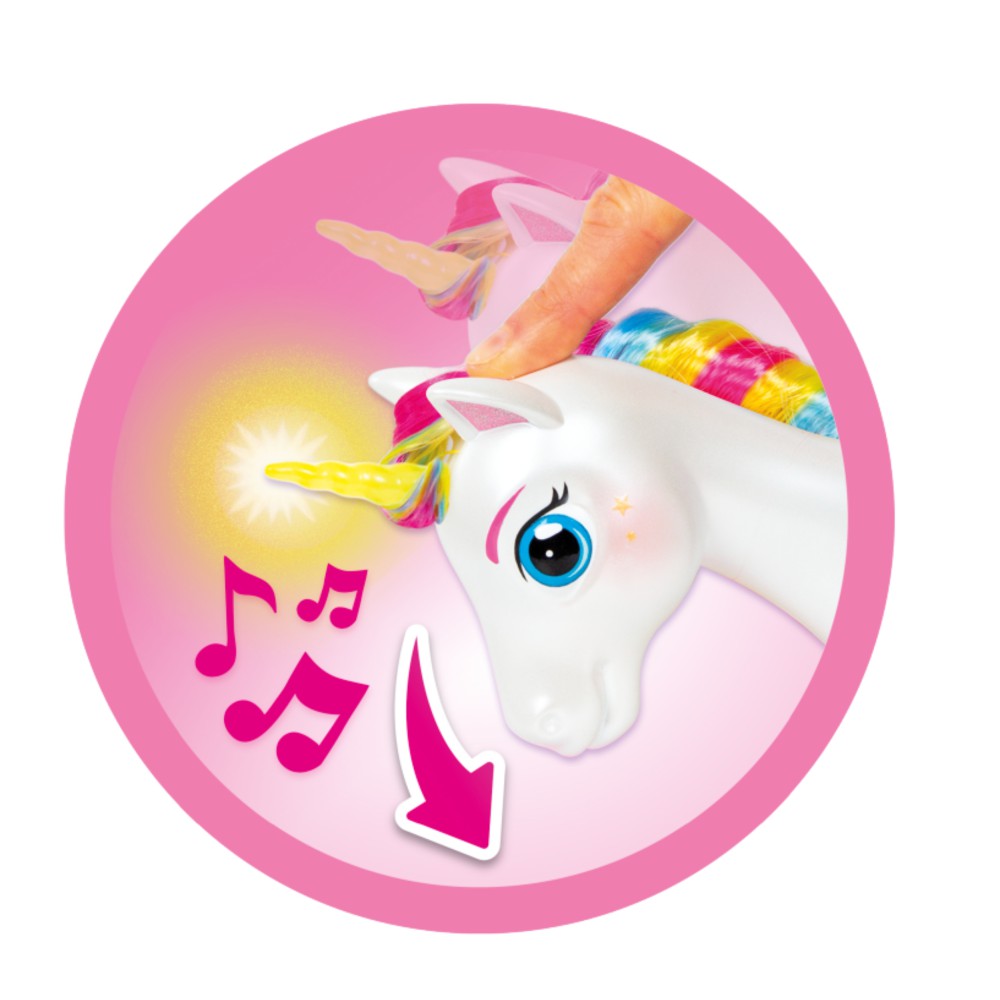 С волшебной белой лошадкой с радужной гривой и хвостом игра становится волшебной! Рог единорога светится желтым, теплым светом. Животное также издает милые звуки, когда нажимаешь на его голову.