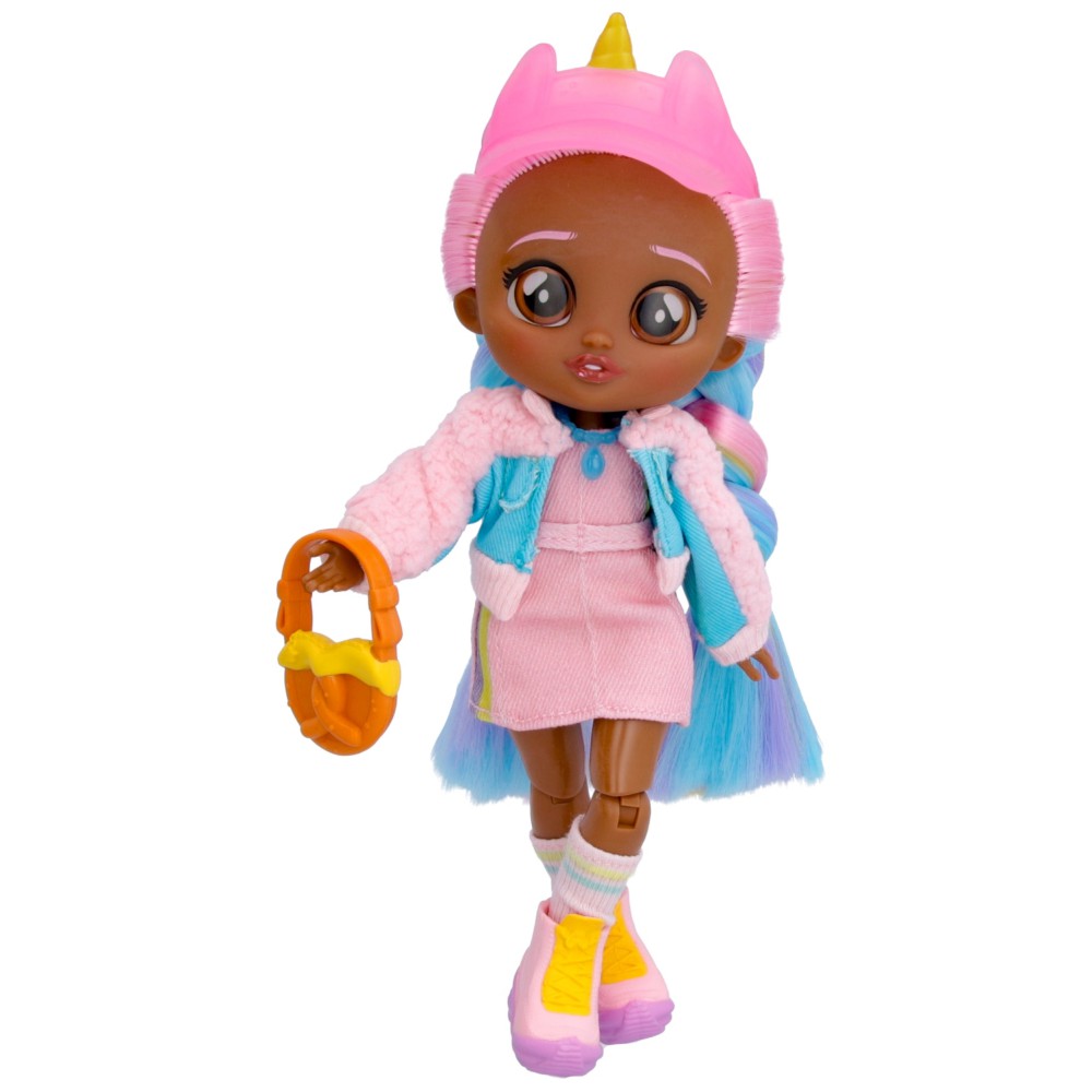 Джесси носит спортивное платье из розовой ткани, пушистую куртку и подходящие кеды. Она украсила свои длинные радужные волосы модной кепкой с козырьком и рогом единорога. Подросток никогда не забывает надеть свое особенное ожерелье BFF!
