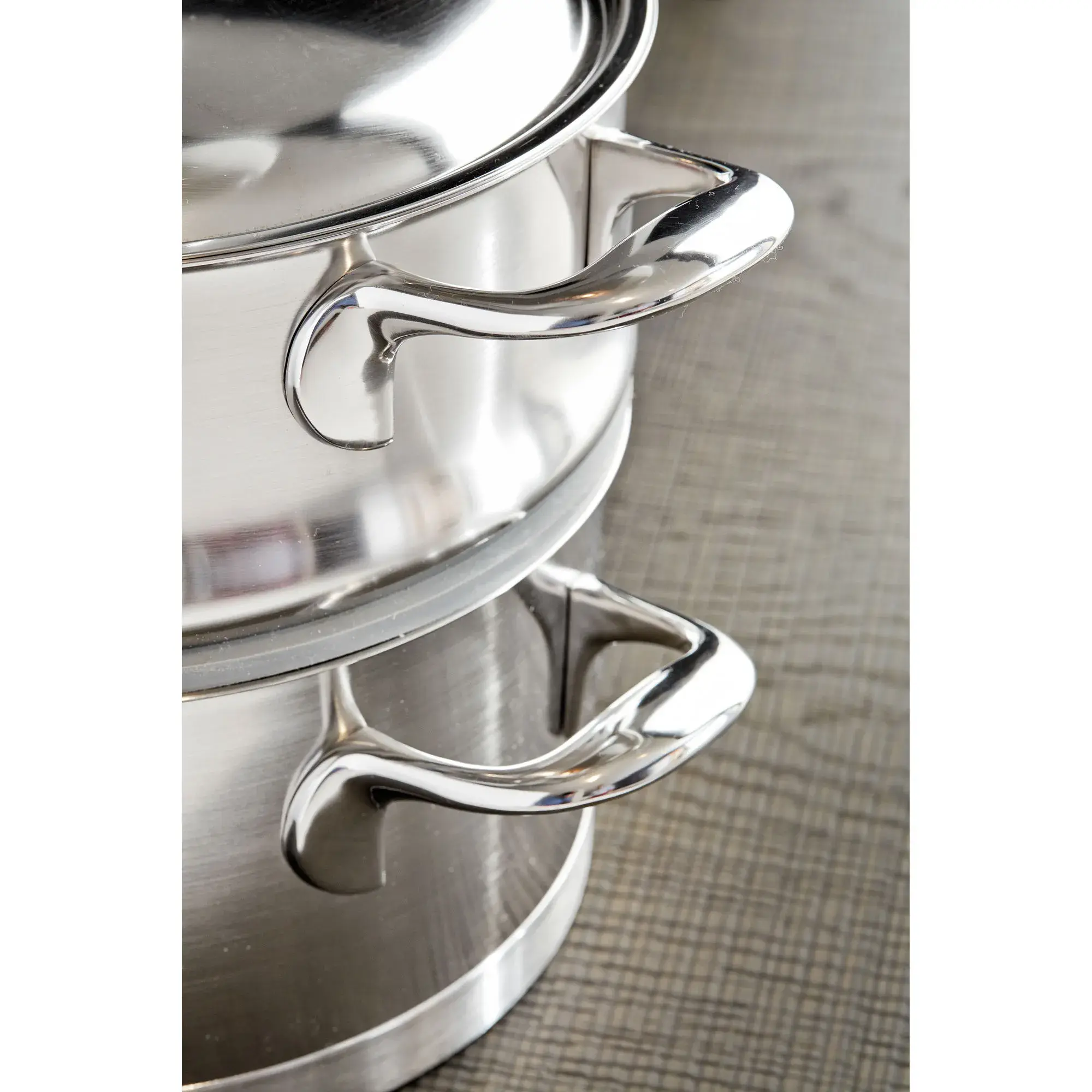Плотно прилегающие крышки предотвращают выход пара, пища готовится быстрее и полезнее, сохраняя ценные вещества и минералы. Эргономичные ручки из стали 18/10 не нагреваются до высоких температур, что делает их удобными в использовании. Благодаря технологии уплотнения ручек они остаются гигиеничными и долговечными. Края кастрюли профилированы, что позволяет легко наливать воду, не боясь пролить ее.