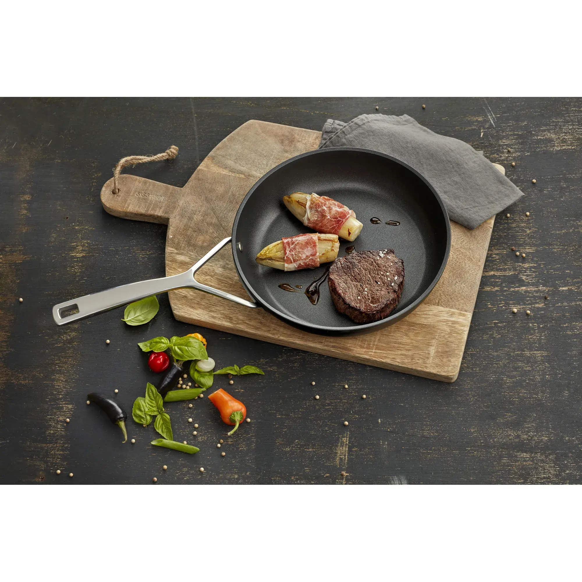 Эргономичные ручки из стали 18/10 не нагреваются до высоких температур. Благодаря технологии уплотнения ручек они остаются гигиеничными и долговечными. Профилированный обод позволяет наливать содержимое, не боясь пролить.