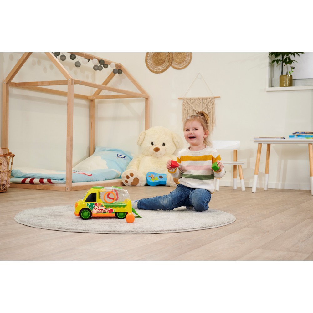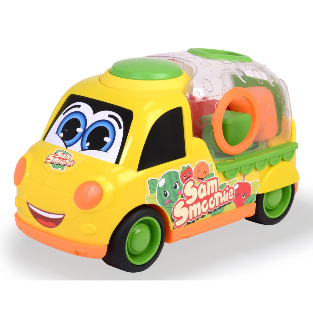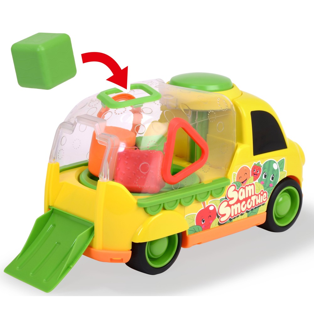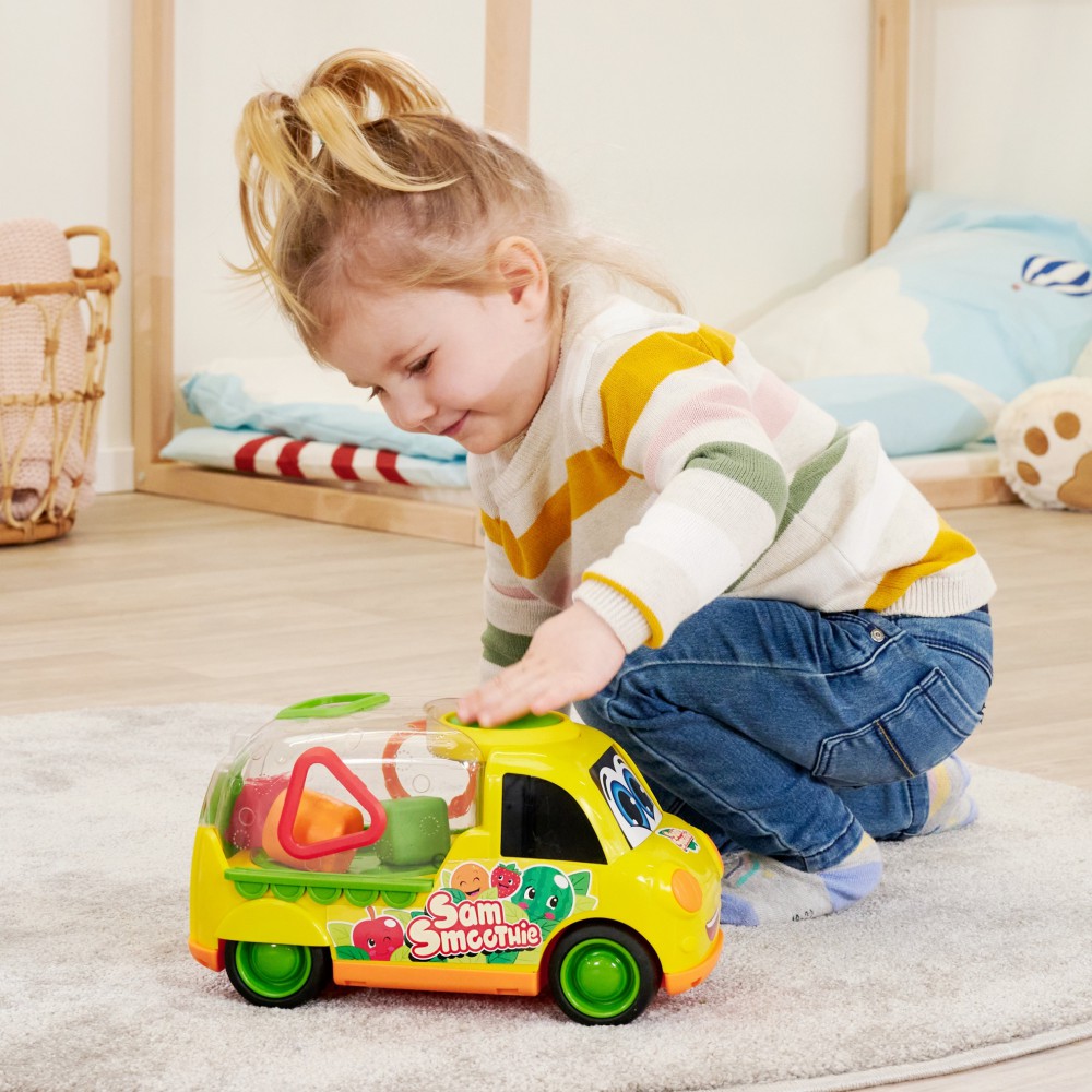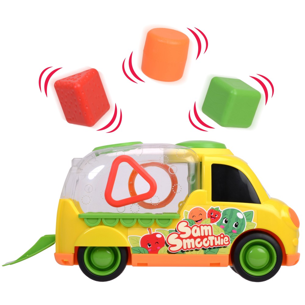 Веселая машинка также является сортером форм. В комплекте три геометрические фигуры - каждая из них напоминает по цвету и текстуре фрукт! Малыш вставляет фигуры в соответствующие места на прицепе машины, тренируя точность пальцев и рук.