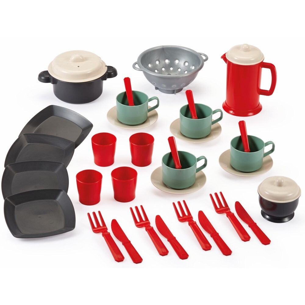 Набор кухонных принадлежностей в сумке содержит все необходимое для веселого приготовления пищи. Прозрачный практичный пакет содержит до тридцати пяти аксессуаров, включая кастрюлю с крышкой, дуршлаг, тарелки, чашки, столовые приборы и другие кухонные принадлежности. Набор идеально подходит для творческих игр дома - дети могут варить суп, подавать блюда и накрывать на стол, одновременно обучаясь основным бытовым задачам. Крупные, легкие и безопасные предметы рассчитаны на детей в возрасте от 18 месяцев.