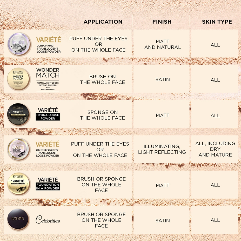 Нанесение макияжа в теплые летние дни может быть настоящим испытанием. Пудра Eveline Cosmetics Variete, специально разработанная на летний сезон, идеально подходит для всех женщин, которые не хотят отказываться от макияжа даже в жаркие дни. Прозрачная формула мгновенно улучшает кожу, фиксирует макияж и продлевает его стойкость.