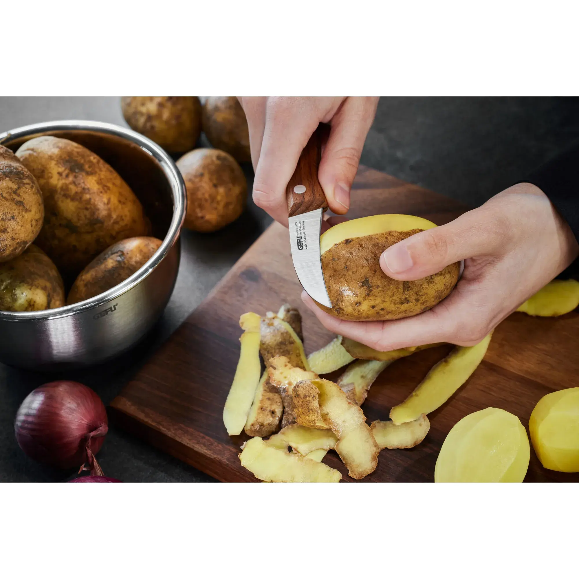Незаменимый классический нож в традиционном дизайне, идеально подходящий для чистки овощей, фруктов и картофеля. Нож для чистки Hummeken от GEFU был тщательно изготовлен из высококачественной немецкой нержавеющей стали, что гарантирует надежность и долговечность. Прочная клепаная рукоятка из элегантного орехового дерева придает инструменту уникальность, сочетая в себе эстетику и функциональность.