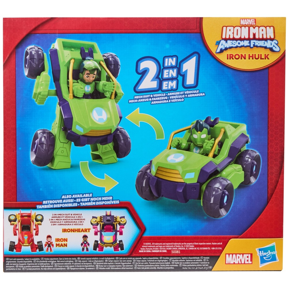 Мех IRON HULK 2в1 - это исполнение мечты каждого маленького фаната Marvel. Этот крутой транспорт быстро превращается в мощного меха, готового к любому вызову. И все это всего в трех простых шагах! Дети могут поместить фигурку Iron Hulka внутрь транспорта как в режиме автомобиля, так и робота. При этом фигурку не нужно вынимать во время трансформации, что делает игру еще более плавной и захватывающей. Прилагаемая фигурка одета в броню, шлем которой можно снять, раскрывая настоящее лицо героя. Зеленая броня, массивная фигура и детали, вдохновленные сериалом "Iron Man and his Awesome Friends", делают Iron Hulk любимцем любой коллекции.