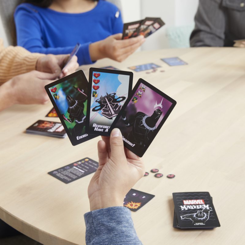 Marvel Mayhem — карточная игра, полная сверхспособностей, удивительного оружия и фантастических доспехов. Отличное развлечение для всей семьи! Вы можете принять участие в этой удивительной битве в роли Железного Человека, Капитана Марвел, Алой Ведьмы или Черной Пантеры. Игра включает в себя 4 колоды карт — хорошо разыграйте их! Колоды отражают приемы, снаряжение и навыки каждого героя. Игроки используют карты, чтобы наносить урон своим противникам, стараясь не уклоняться от их атак! Легкий геймплей, который можно повторять много раз, обеспечит отличное развлечение на многие вечера с друзьями и семьей.