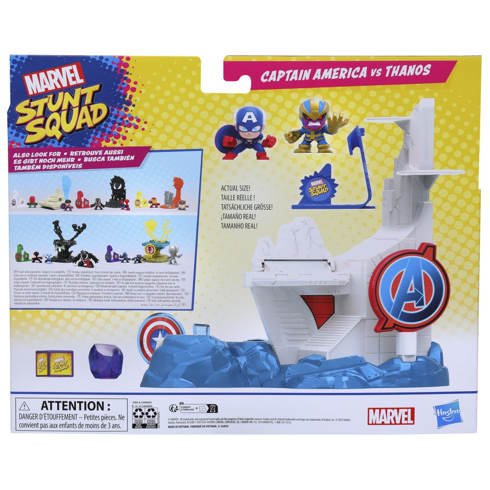 Набор Капитан Америка против Таноса состоит из двух резиновых фигурок, пушки и здания. Даже четырехлетние дети могут играть с этим забавным набором и представлять себе окончательное противостояние между американским супергероем и одним из самых могущественных суперзлодеев из вселенной Marvel.