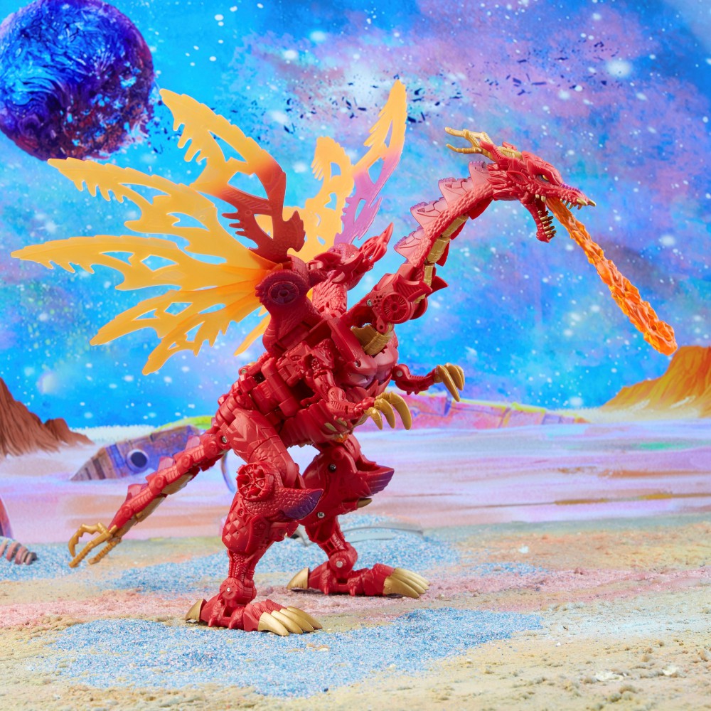 Фигурка Leader Transmetal II Megatron превращается из робота в дракона за 33 шага. Красный дракон с крыльями имеет подвижное шею, хвост и крылья, что позволяет установить фигурку в эффектной позе. В комплекте с драконьей пастью идет элемент, имитирующий дымящийся огонь, чтобы создать эффект настоящей битвы Transformers!