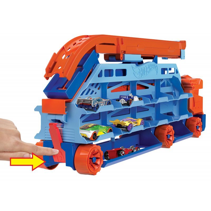 - Transporter может перевозить более 20 автомобилей Hot Wheels и имеет большие вращающиеся колеса.