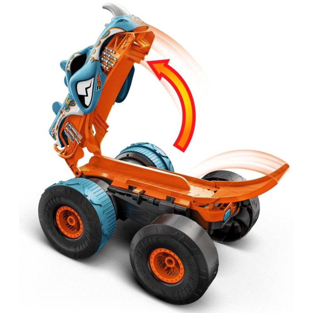 Машина трансформируется в ускоритель для меньшего Монстр-трака масштаба 1:64 и может запустить машину на высоту до девяноста сантиметров! Гоняйте, разбивайтесь и устраивайте аварии!