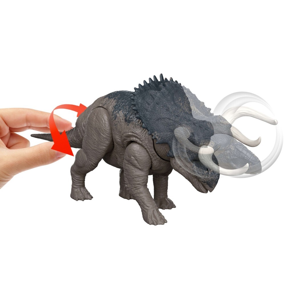 Jurassic World Roaring Nasutoceratops - реалистично выполненная фигурка травоядного гиганта из доисторических времен. Игрушка впечатляет не только своим внушительным внешним видом, но и интерактивными функциями: она издает пронзительный рев и совершает атаку с помощью хвоста. Дети могут двигать хвостом вверх-вниз или крутить его, чтобы изменить направление атаки, создавая захватывающие игровые сценарии!