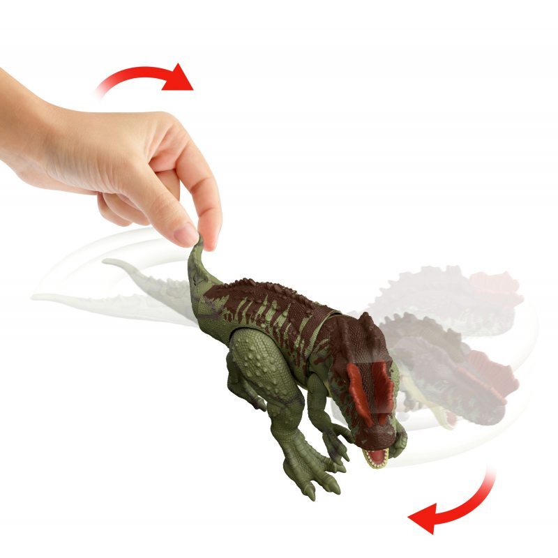 Фигурка имеет подвижные части, такие как щелкающие челюсти, поворачивающаяся шея и поднятые ноги. Чтобы активировать мощную атаку динозавра — сокрушительные челюсти — нажмите кнопку на хвосте модели.