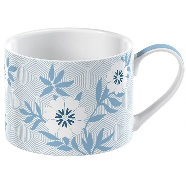 На фоне геометрического шестиугольного узора расположены нежные сине-белые цветы. Несмотря на изысканный дизайн, он имеет современную форму – в ширину больше, чем в высоту. Кружка изготовлена из высококачественного костяного фарфора. Изделие можно мыть в посудомоечной машине.
