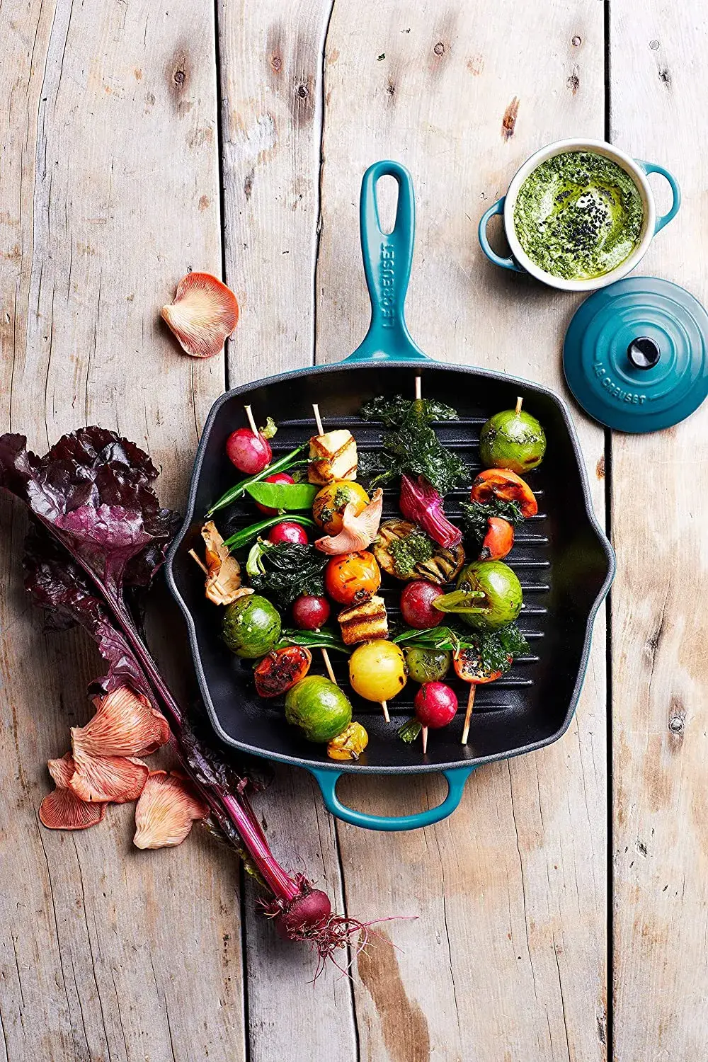 Чугунная сковорода-гриль от французского бренда Le Creuset диаметром 26 см – изделие, предназначенное для жарки мяса и овощей. Благодаря черной эмали, покрывающей ребра, вы получите хрустящие блюда на гриле, а желобки отвечают за транспортировку жира, благодаря чему приготовленные вами блюда будут напоминать блюда, приготовленные на настоящем гриле.
