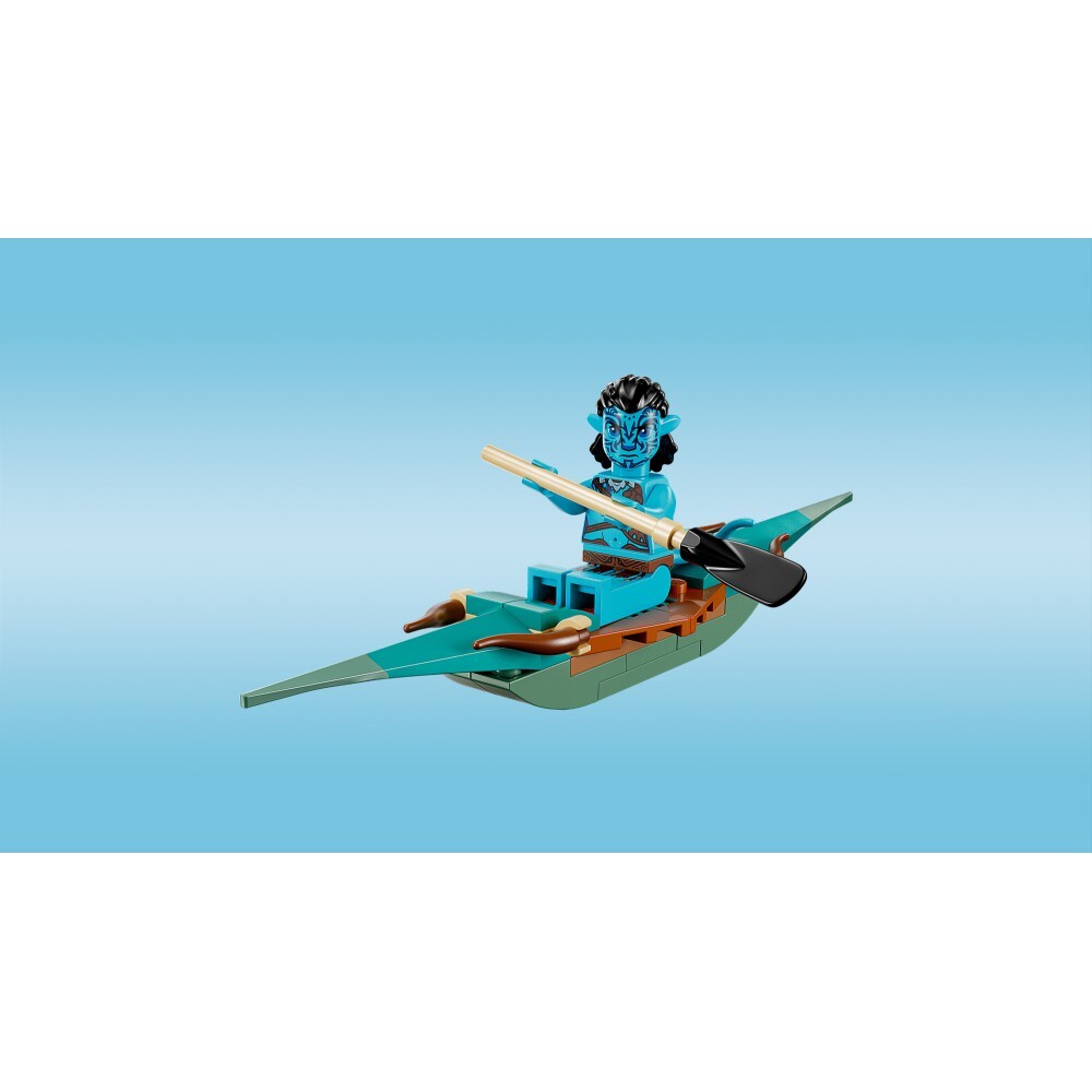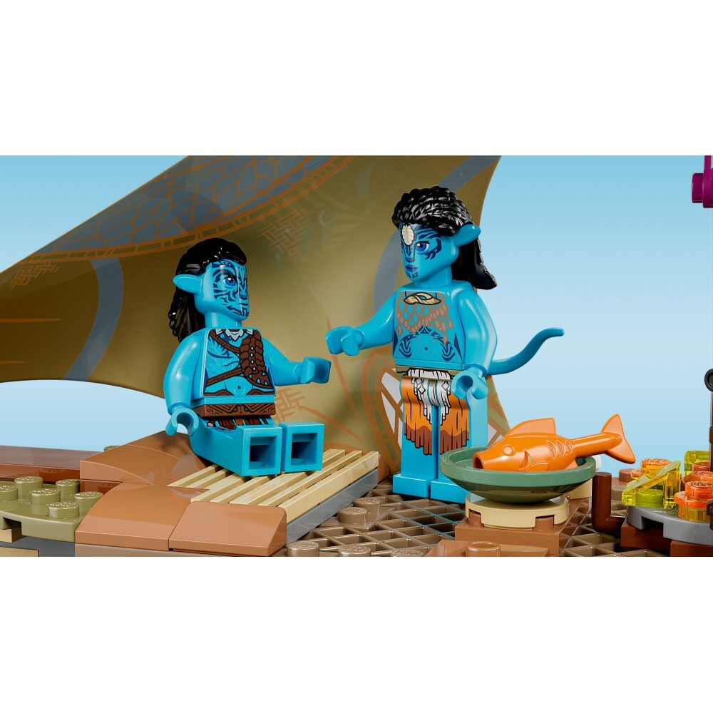 Что в коробке? - В комплект входит дом клана Меткаина с элементами из фильма «Аватар: Водное существо», а также лодка, пейзажи Пандорийского рифа и минифигурки Нейтири, Кири, Ронала и Тоновари.