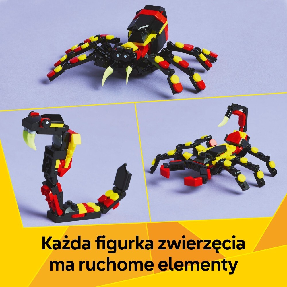 У любителей животных есть три разных способа собрать один и тот же набор кирпичиков. Они могут создать подвижного паука LEGO с растягивающейся нитью, подвижную фигурку скорпиона или величественную змею. Все три модели животных из этого набора отлично подойдут для творческих подарков детям.