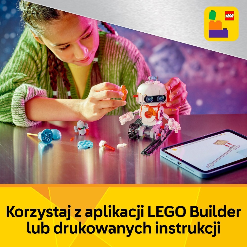 - Восьмилетние дети и дети постарше могут разыгрывать межзвездные истории с помощью этого набора LEGO Creator 3-в-1 "Космический робот" (31164). Робот стоит на подвижных гусеницах, у него есть реактивный ранец, воздушный шар и светящийся блок, освещающий его туловище. Кроме того, у фигурки вращаются голова и туловище, а также подвижные руки и пальцы.