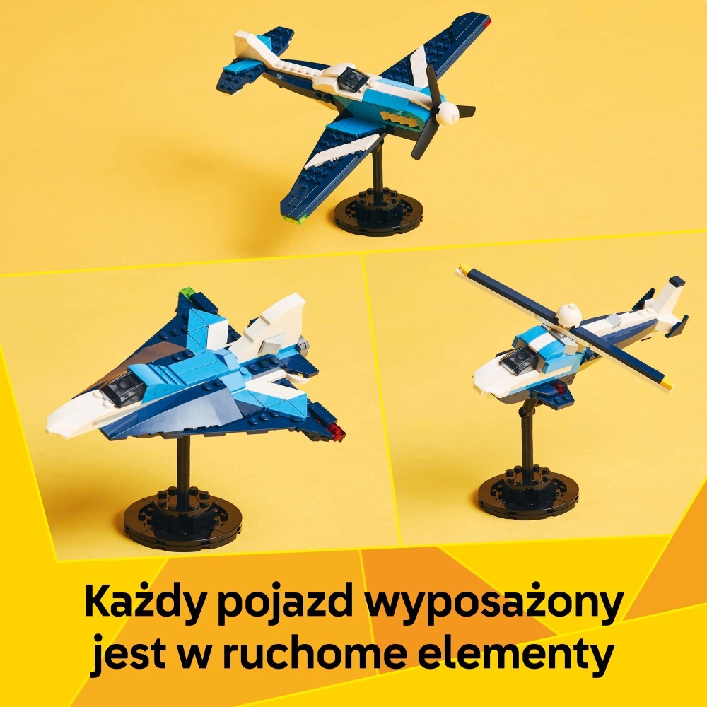 - Сверхбыстрые приключения в небе ждут семилетних и более старших детей благодаря набору LEGO Creator 3-в-1 "Воздушный корабль: гоночный самолет" (31160). У модели аэроплана есть вращающийся пропеллер спереди и подвижные колеса, чтобы он мог ездить по земле, а также основа из блоков для демонстрации.
