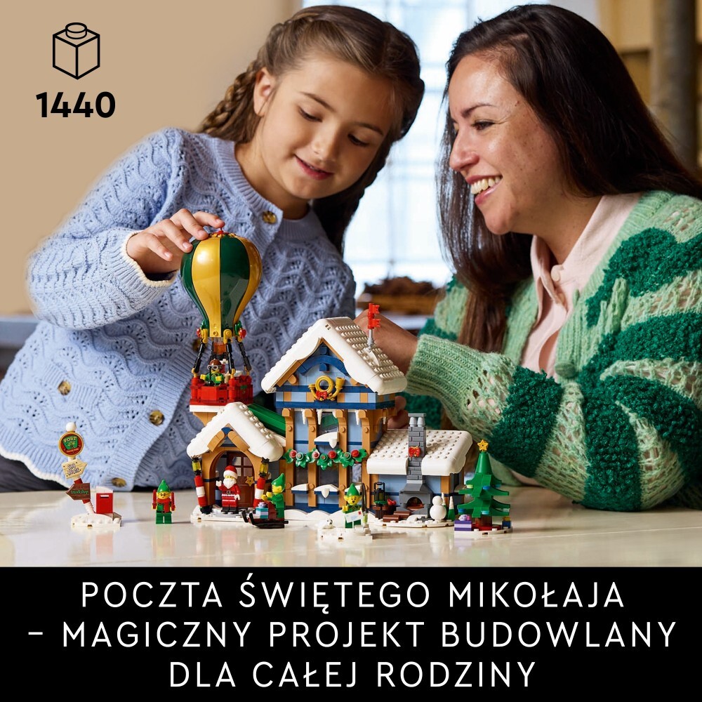 Заснеженное почтовое отделение включает в себя кабинет Санты с уютным камином, комнату для сортировки почты, прихожую с кофеваркой и зону для письма на втором этаже с желобом для писем. Среди других моделей - воздушный шар со светящейся горелкой, двусторонний сортировщик писем, сцена подледной рыбалки, рождественская елка, указатель, почтовый ящик и сани, а также минифигурка Санты и четыре фигурки эльфов.