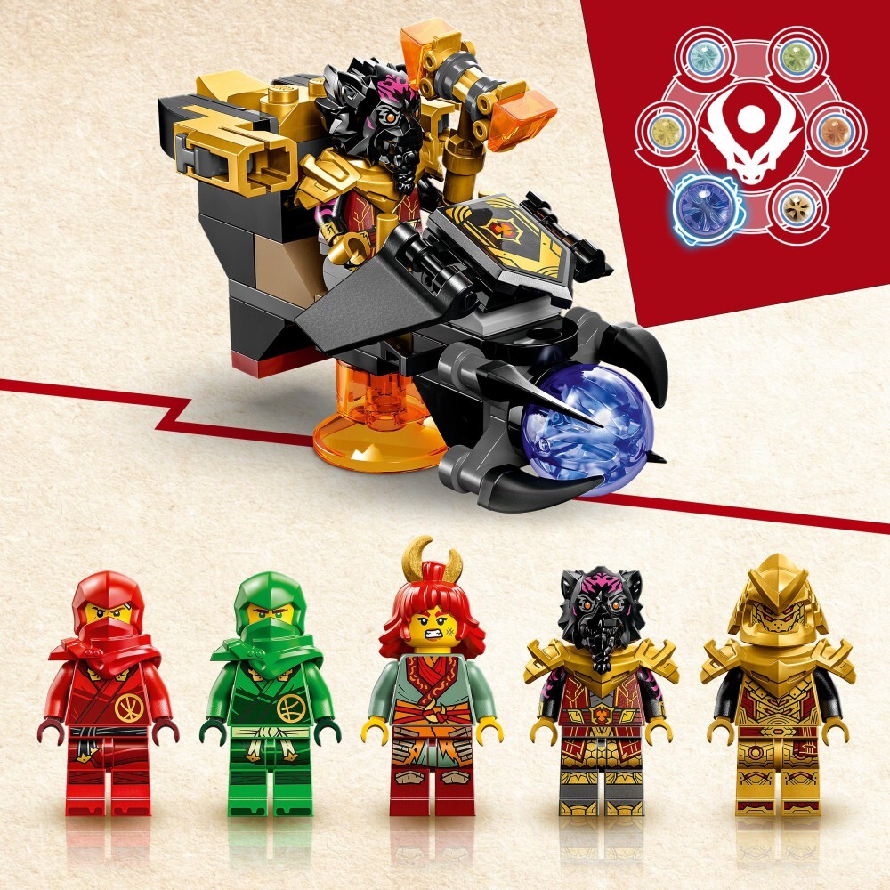 Набор, полный минифигурок и крутых аксессуаров. В этот набор драконов-ниндзя входят 5 минифигурок: Кая с двумя катанами, Уайлдфайра с огненным кулаком, Имперского Охотника на Когти с мечом и Лорда Раса с золотым молотом и судном на воздушной подушке. В других наборах NINJAGO также есть четыре элемента силы дракона разных цветов и три ядра энергии дракона.