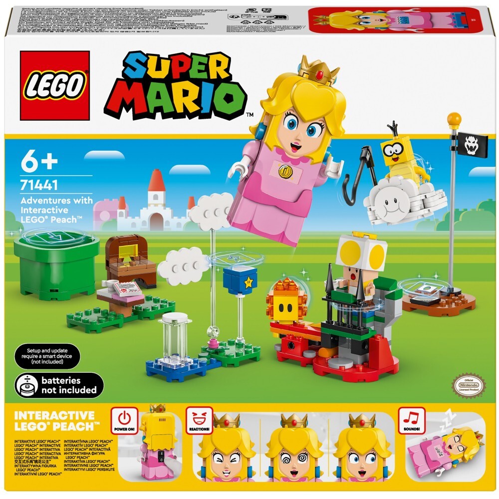 - Присоединитесь к культовому персонажу игры Super Mario на пикнике и взлетите сквозь облака, чтобы спасти Желтого Жаба, с помощью набора LEGO Peach Interactive Figure Adventure Set (71441). Этот идеальный подарок в стиле Nintendo для детей и геймеров от шести лет включает в себя интерактивную фигурку LEGO Peach, а также Лакиту, Желтого Жаба и Лавового Пузыря. Пройдите от стартовой трубы до конечного столба, вызывая цифровые реакции LEGO Peach и собирая по пути монетки. Устройте пикник, прочитайте письмо о том, что Желтая Жаба похищена, сбросьте Лакиту с облака, летайте, делайте сальто и петли на облаке, чтобы спасти своего друга. На облаке также есть удочка, с помощью которой Лакиту может поднять сиденье для пикника Желтой Жабы.