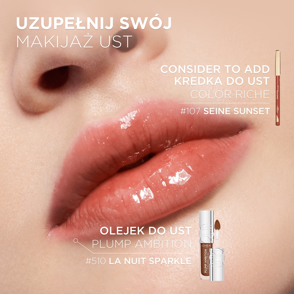 Для достижения эффекта более объемных и увлажненных губ нанесите необходимое количество блеска L’Oreal Paris Plump Ambition на чистые губы. Можно использовать его самостоятельно или поверх любимой помады, чтобы добавить блеска и объема. Благодаря компактной упаковке продукт легко поместится в сумочке, что позволяет быстро наносить его в течение дня.