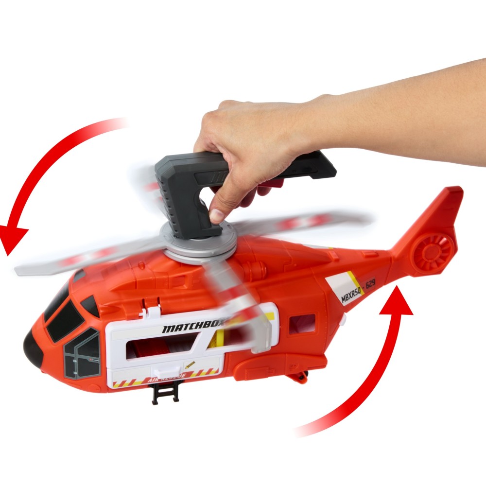Большой вертолет Matchbox готов отправиться в спасательную миссию! Нажмите рычаг на рукоятке, чтобы активировать винт и имитировать настоящий полет вертолета. Вжууум! Куда ты сегодня полетишь?