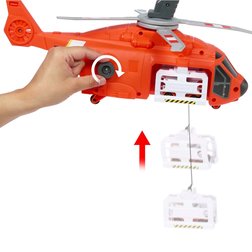 Прилети на место происшествия и поверните ручку, чтобы опустить лебедку. Опустите ее и спасите машину! В комплекте металлическая машина Matchbox в масштабе 1:64. Зафиксируйте транспортное средство в клетке, а затем поднимите его на борт - какое действие!