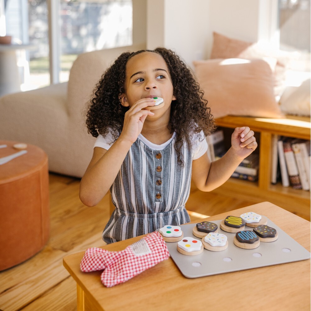 В набор входят двенадцать деревянных печений для вырезания и двенадцать вкусных украшений (шоколадная глазурь, ванильная глазурь, посыпки, глазурь). А также игрушечный нож, лопатка для подачи, противень и даже кухонная рукавица, чтобы доставать горячую выпечку из воображаемой духовки. Благодаря самоклеящимся полоскам-липучкам печенье и украшения легко собираются вместе и режутся с реалистичным сопротивлением. Когда игра закончится, дети смогут хранить печенье в прочном пластиковом тубусе, чтобы оно было готово к следующему разу.