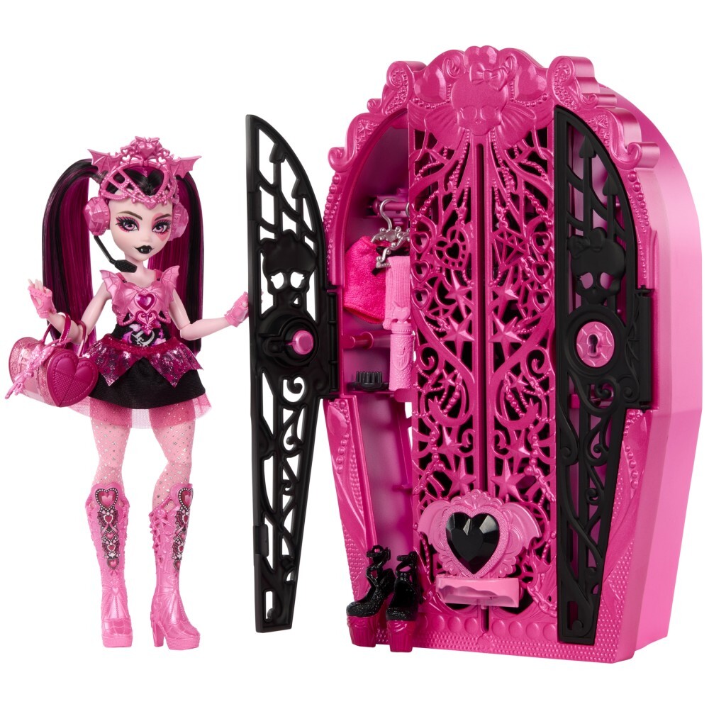 Кукла Дракулаура обладает неповторимым шармом. Она стилизует себя под поп-звезду и любит выступать на сцене. Откройте сумки с сюрпризами, чтобы найти уникальные аксессуары. Вы можете комбинировать их как угодно, чтобы создать уникальные сценические творения! Пришло время выступать!