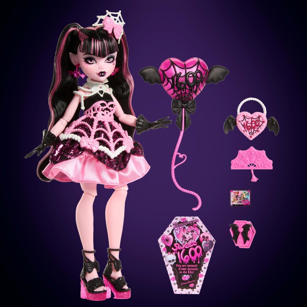 Кукле DRACULAURA исполнилось 1600 лет, и она демонстрирует неподражаемый стиль в своем вампирском наряде. На ювелирке атласное розово-черное платье с узором в виде каре и паутины и черные перчатки. Жемчужный ошейник украшает ее шею и плечи, а туфли на каблуках с бантами придают всему наряду чудовищную элегантность. Благодаря уникальным элементам декора, таким как веер, украшения и сумочка, и детям, и взрослым коллекционерам будет очень весело наряжать куклу для вечеринки! Дракулаура готова к вечеринке как никогда раньше!