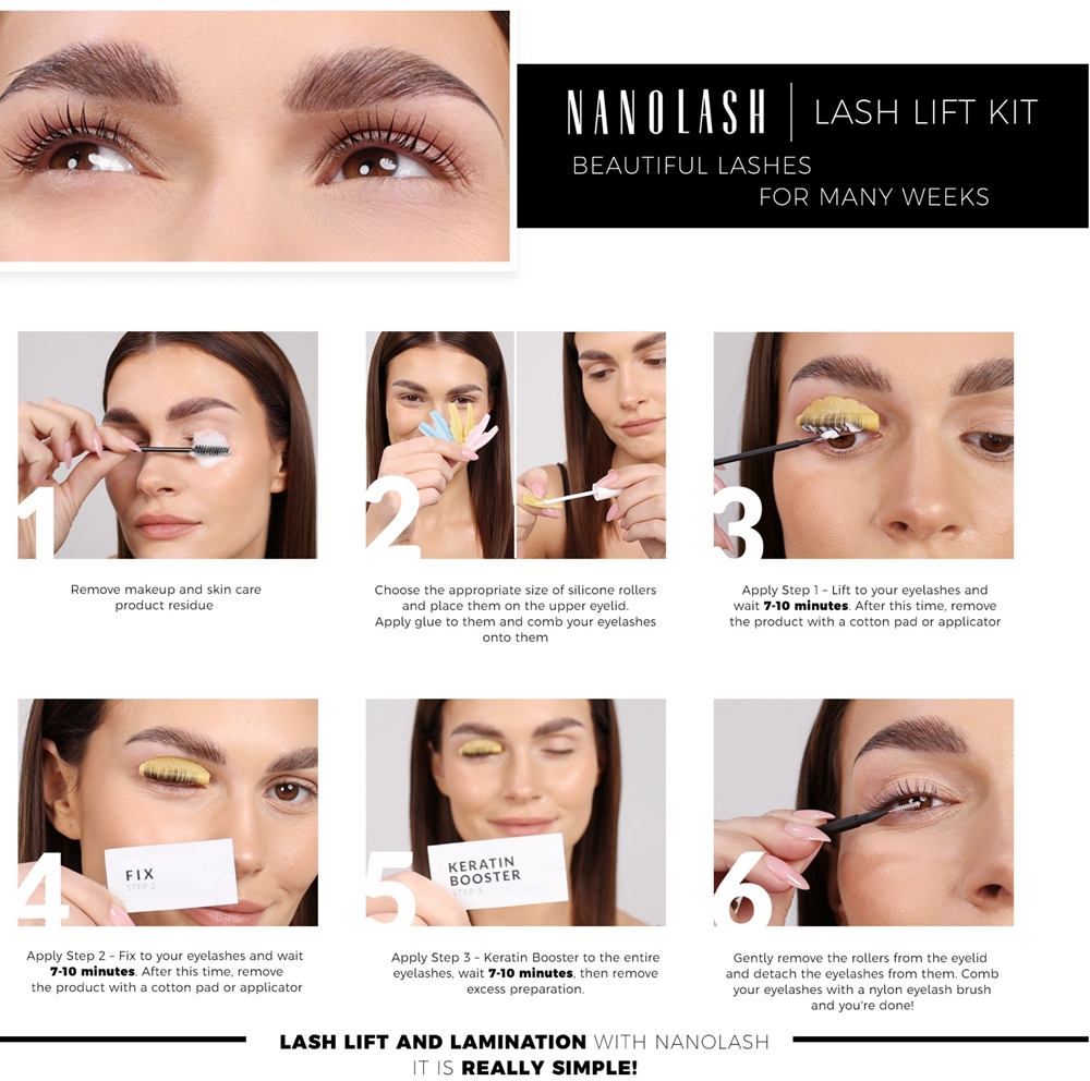Выберите подходящий размер Nanolash Silicone Rods, который лучше всего подходит для длины и формы ресниц. Положите подушку на веко, затем с помощью профессионального клея для подъема прикрепите ресницы к силиконовой поверхности. Помните о тщательном расчесывании ресниц, чтобы получить равномерный эффект и обеспечить их красивое поднятие.