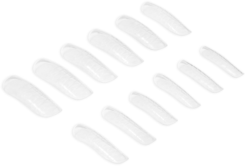 Удалите все загрязнения с ногтей, отпилив их и обезжирьте. Затем нанесите базу на ногти и зафиксируйте под LED/UV лампой. Нанесите необходимое количество геля на внутреннюю сторону шаблона, чтобы выровнять и достичь желаемой длины, используя кисть, погруженную в обезжириватель. Затем приложите шаблон к ногтевой пластине, нежно прижмите и снова зафиксируйте под лампой. Снимите шаблон с ногтя, отформуйте ноготь пилочкой.