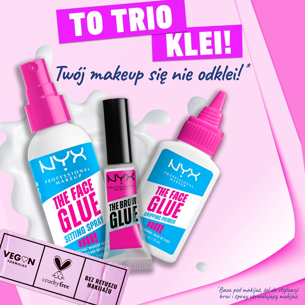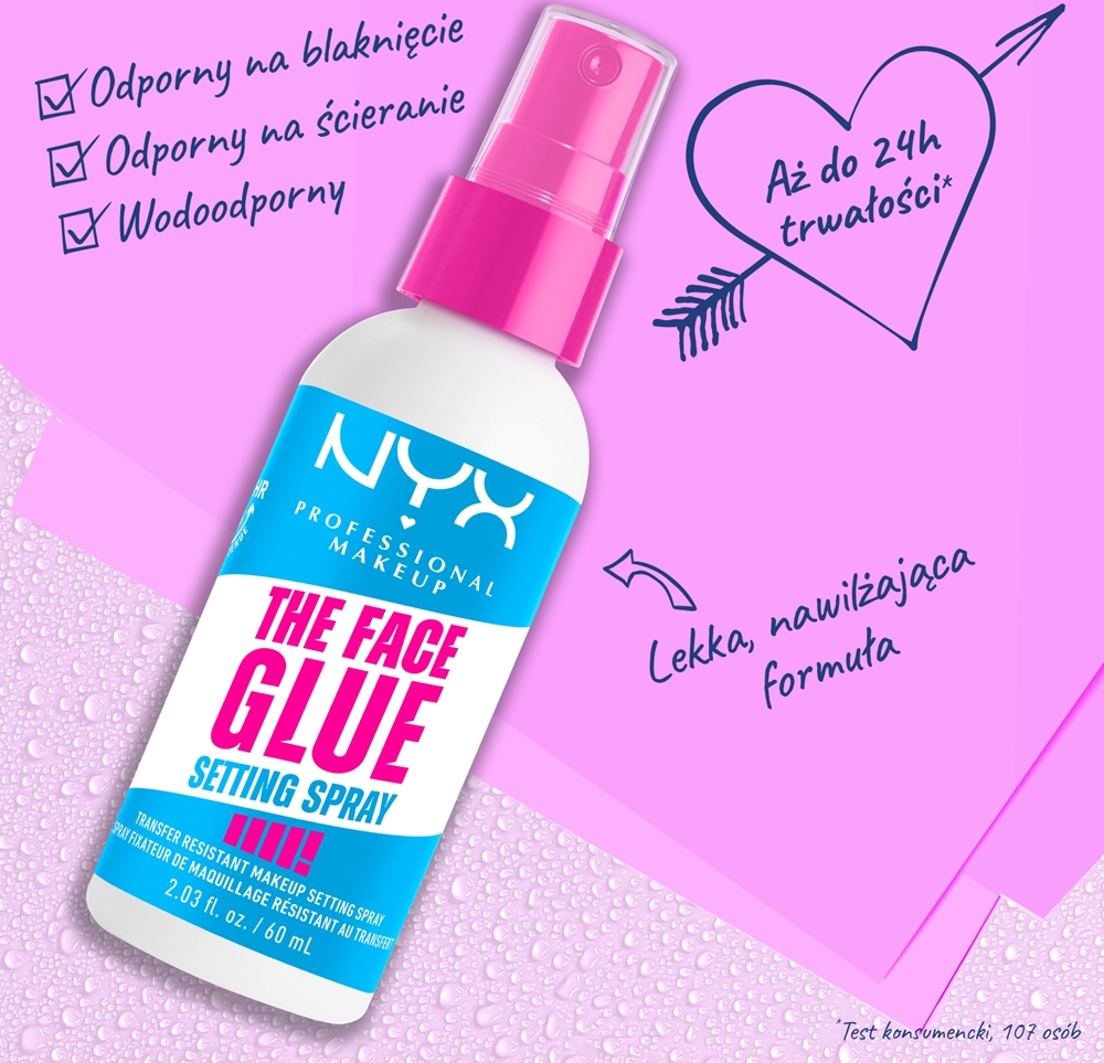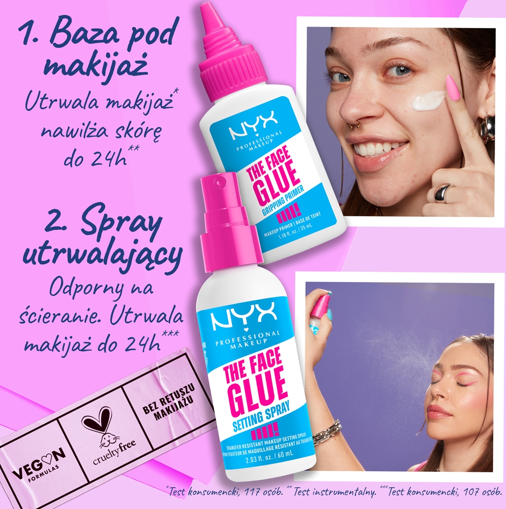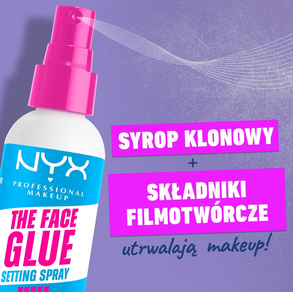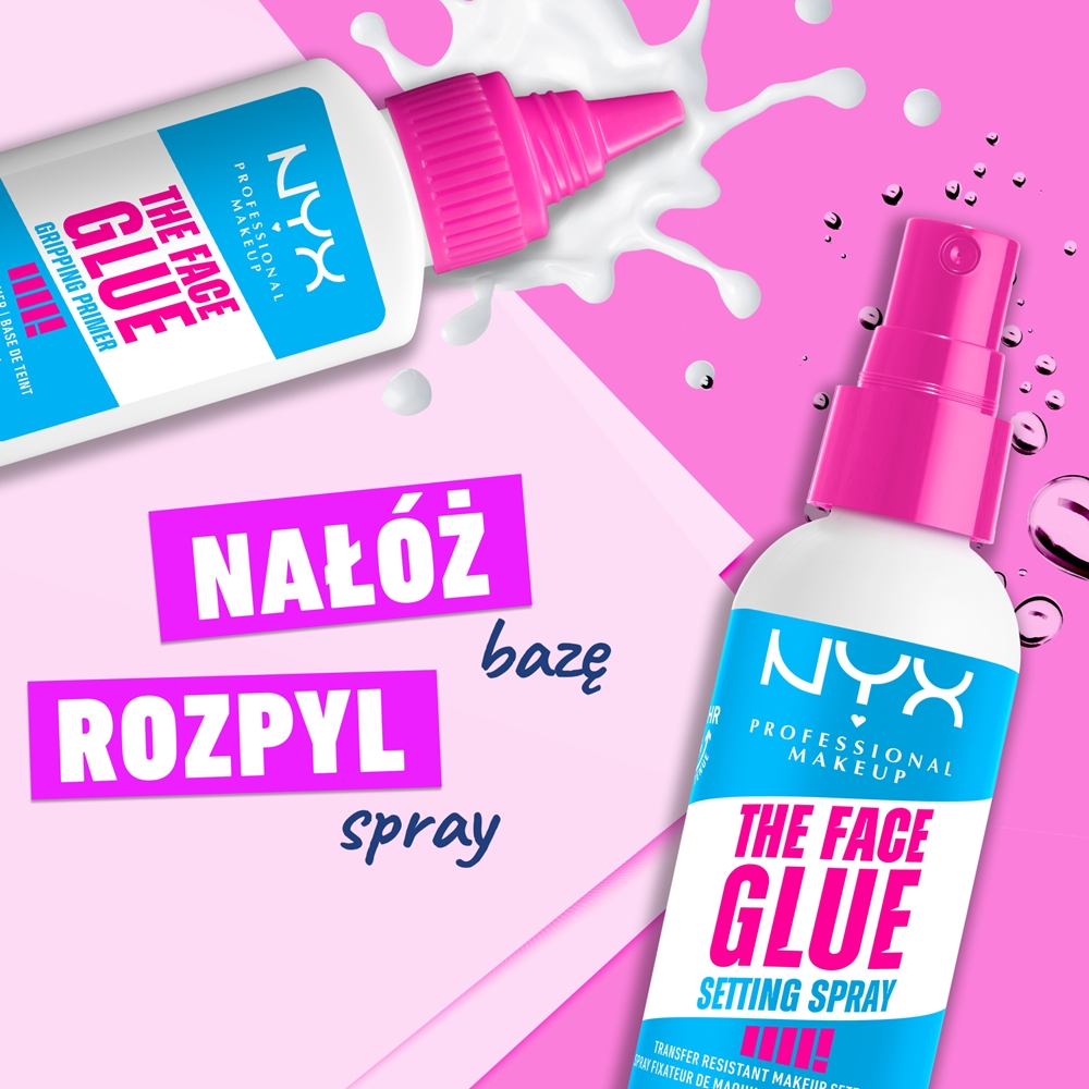 Перед использованием хорошо взболтать. Держа баллончик спрея для фиксации макияжа NYX Professional Makeup The Face Glue на расстоянии вытянутой руки от лица, равномерно распылите на готовый макияж. Для более интенсивного эффекта можно использовать спрей между слоями макияжа.
