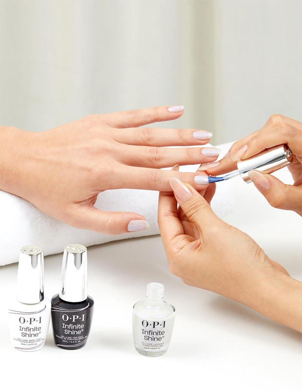 Для ухода за здоровьем ногтей перед нанесением цветного лака для ногтей используйте базовый лак для ногтей OPI Infinite Shine.