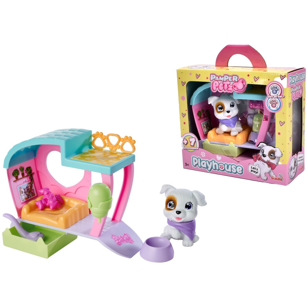 Simba PAMPER PETZ Домик с щенком и аксессуарами для ухода позволяет детям погрузиться в мир заботы и дружбы. В милом пастельном домике живет маленький белый щенок с коричневым пятном - он готов к ежедневным приключениям и полному заботливому уходу!