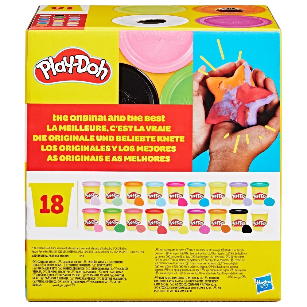 Play-Doh - это настоящий праздник для... воображения! Внутри коробки вы найдете целых восемнадцать баночек Play-Doh (по 85 г каждая) самых разных цветов - от классических красного, желтого и зеленого до различных оттенков фиолетового, розового, голубого и коричневого. Это идеальный вариант для детей, которые любят творить, смешивать цвета и наклеивать все, что подскажет им воображение! Мягкая, тактильная масса и характерный запах - сочетание, которое уже много лет делает Play Doh одной из любимых игрушек дошкольников. Набор хорошо подойдет как для пополнения домашней коллекции, так и в качестве запасного комплекта для занятий творчеством в детском саду или школе.